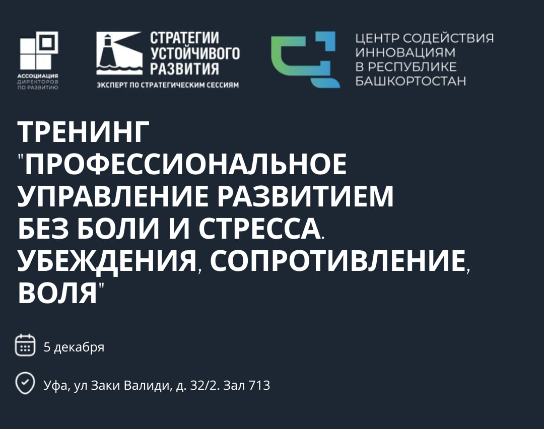 Тренинг "ПРОФЕССИОНАЛЬНОЕ УПРАВЛЕНИЕ РАЗВИТИЕМ БЕЗ БОЛИ И СТРЕССА. Убеждения, сопротивление, воля" — авторская программа Ассоциации директоров по развитию и Российской консалтинговой компании «Стратегии устойчивого развития», организованный совместно с Центром содействия инновациям в Республике Башкортостан